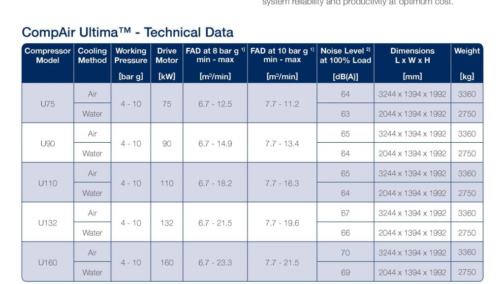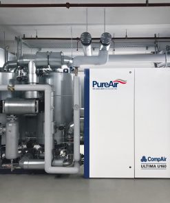 Máy nén khí không dầu Compair Ultima U75~U160 Series là dòng máy nén khí Trục vít khô dẫn động trực tiếp đến cụm nén bằng 2 động cơ kết hợp hộp số (Gearbox) điện tử với dải công suất từ 75 ~ 160kW với thiết kế hiệu quả, bền bỉ, mạnh mẽ, tiết kiệm năng lượng, độ ồn thấp.